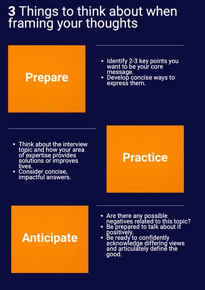 Before beginning your media engagement journey, work with your team to create a key message document. Consider likely questions and the points you want to convey. Combine the two to formulate answers that are easy to understand, memorable, and actionable.